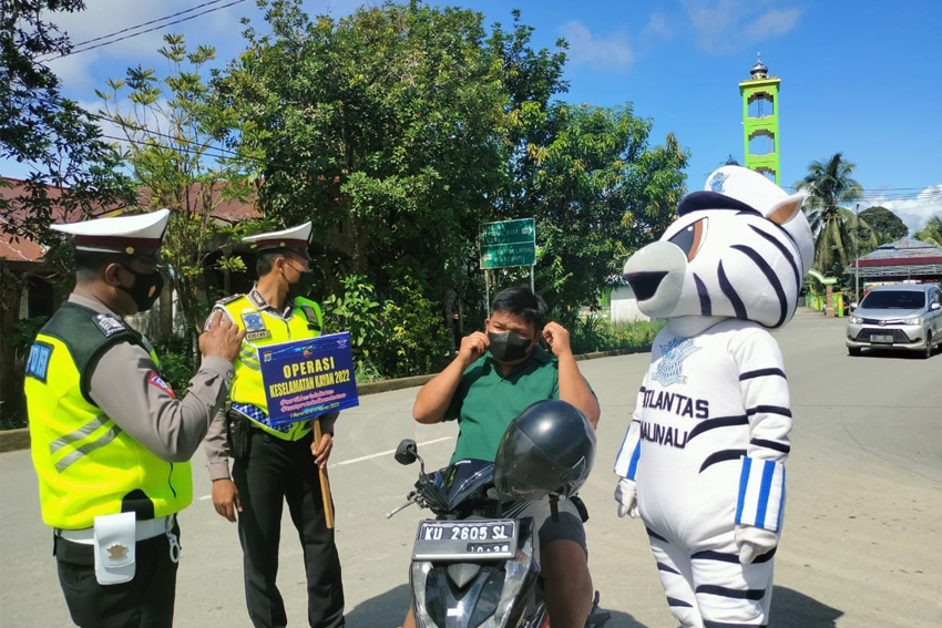 “Pemberian edukasi tertib berlalu lintas dan pemberian masker ini dilakukan kepada pengendara yang melintas yang kedapatan tidak menggunakan masker,†ucap Oman