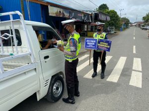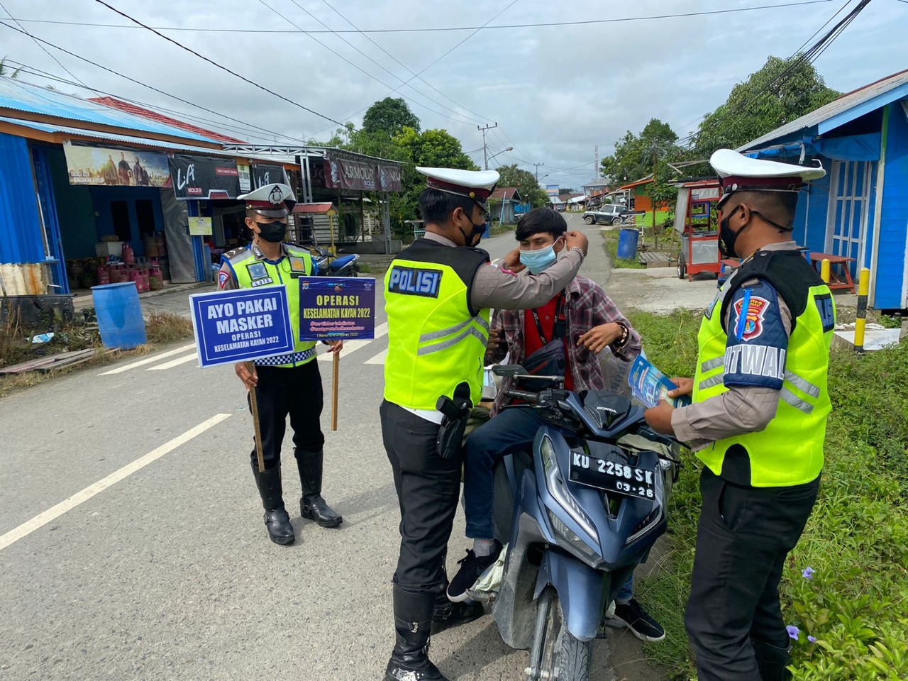 Dalam rangka pelaksanaan Operasi Keselamatan Kayan 2022 hari ini, personil Satuan Lalu Lintas bersama satuan tugas operasi lainya memberikan himbauan tentang kedisplinan dalam berlalu lintas dan protokol kesehatan dengan membagikan masker serta pamflet atau brosur kepada masyarakat pengguna jalan yang melintas.