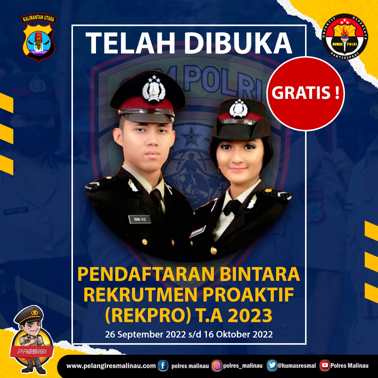 • Hay sobat Polri…. Telah Dibuka Pendaftaran BintaraRekrutmen Proaktif (Rekpro) T.A 2023Pendaftaran : 26 September 2022 s/d 16 Oktober 2022Yukkk daftar dan persiapkan diri