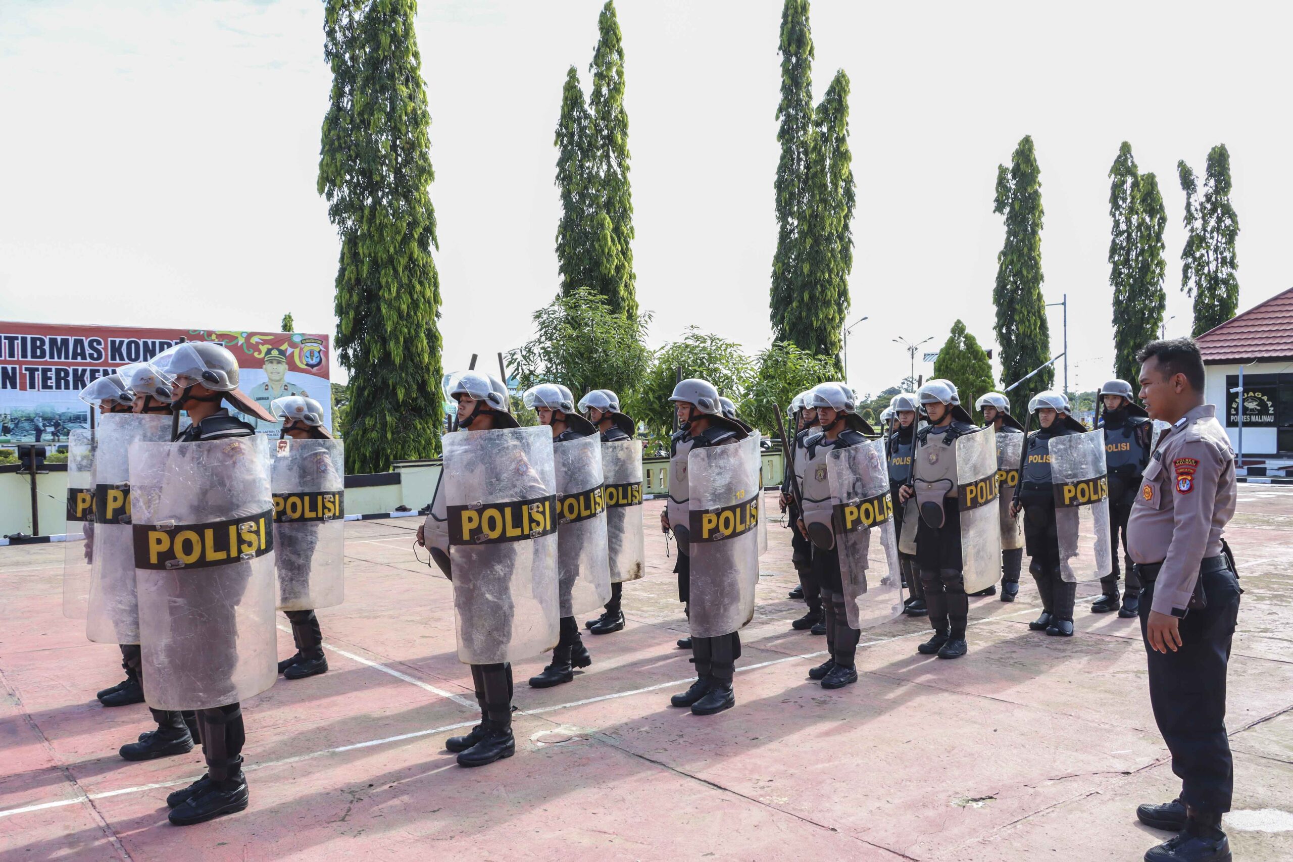 Malinau – Personel Polres Malinau melaksanakan latihan Pengendalian Massa (Dalmas) dalam rangka untuk meningkatkan profesionalitas personel saat bertugas dan meningkatkan kemampuan Pengendalian Massa (Dalmas) bertempat dilapangan apel Mapolres Malinau dengan menggunakan perlengkapan tameng dan tongkat usai pelaksanaan apel pagi, Senin (28/11).