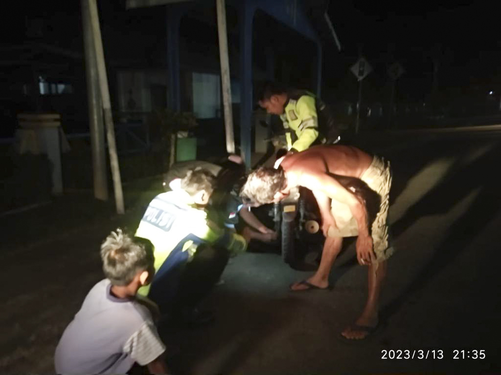 Malinau – Kesigapan personel Kepolisian kembali ditunjukkan jajaran Polres Malinau melalui personel Satuan Lalulintas (Sat Lantas) saat menjumpai sebuah kendaraan roda dua yang dikendari seorang warga yang melintas di JL. Raja Pandhita, Simpang Tiga Tanjung Belimbing, Desa Malinau Hulu mengalami mati mesin, Senin (13/3) malam.