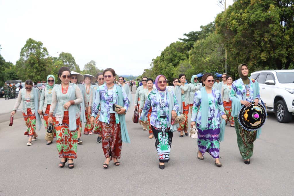Ketua Bhayangkari Cabang Malinau Ny. Dewi Andreas (No. 2 dari kanan) beserta pengurus Bhayangkari Cabang Malinau dan Polisi Wanita (Polwan) Polres Malinau turut ikut serta dalam Parade Perempuan Berkebaya tahun 2023 yang digelar Gabungan Organisasi Wanita (GOW) Kabupaten Malinau di lapangan Panggung Kesenian Budaya Padan Liu’ Burung pada Sabtu pagi ini yang diikuti oleh 35 organisasi wanita yang tergabung dalam GOW Kabupaten Malinau.