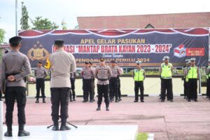 Malinau – Menjelang dimulainya tahapan Pemilihan Umum (Pemilu) Tahun 2024 mendatang, Kepolisian Resor (Polres) Malinau melaksanakan Apel Gelar Pasukan Operasi Mantap Brata Kayan 2023-2024 yang berlangsung di Lapangan Apel Mapolres Malinau, Selasa (17/10/2023).