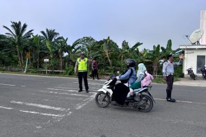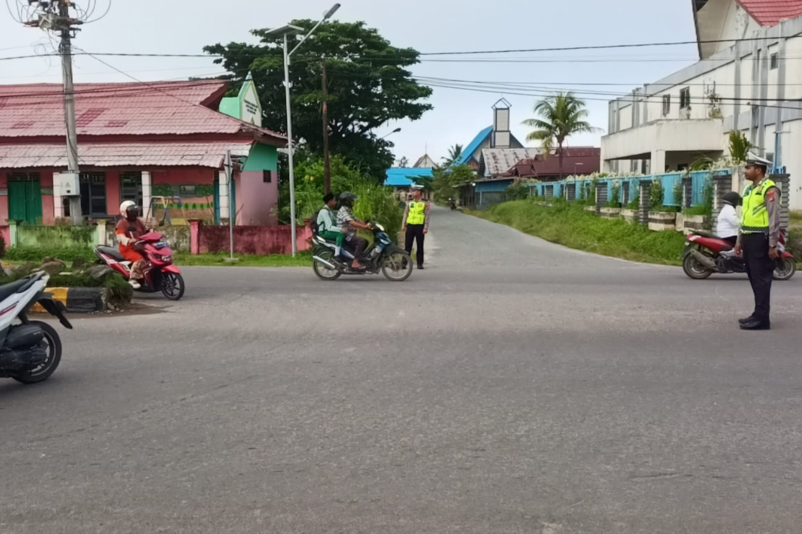 Personel Satlantas terlihat sigap mengatur lalu lintas di beberapa persimpangan utama dan kawasan sekolah, memastikan kelancaran arus kendaraan serta membantu penyeberangan masyarakat.