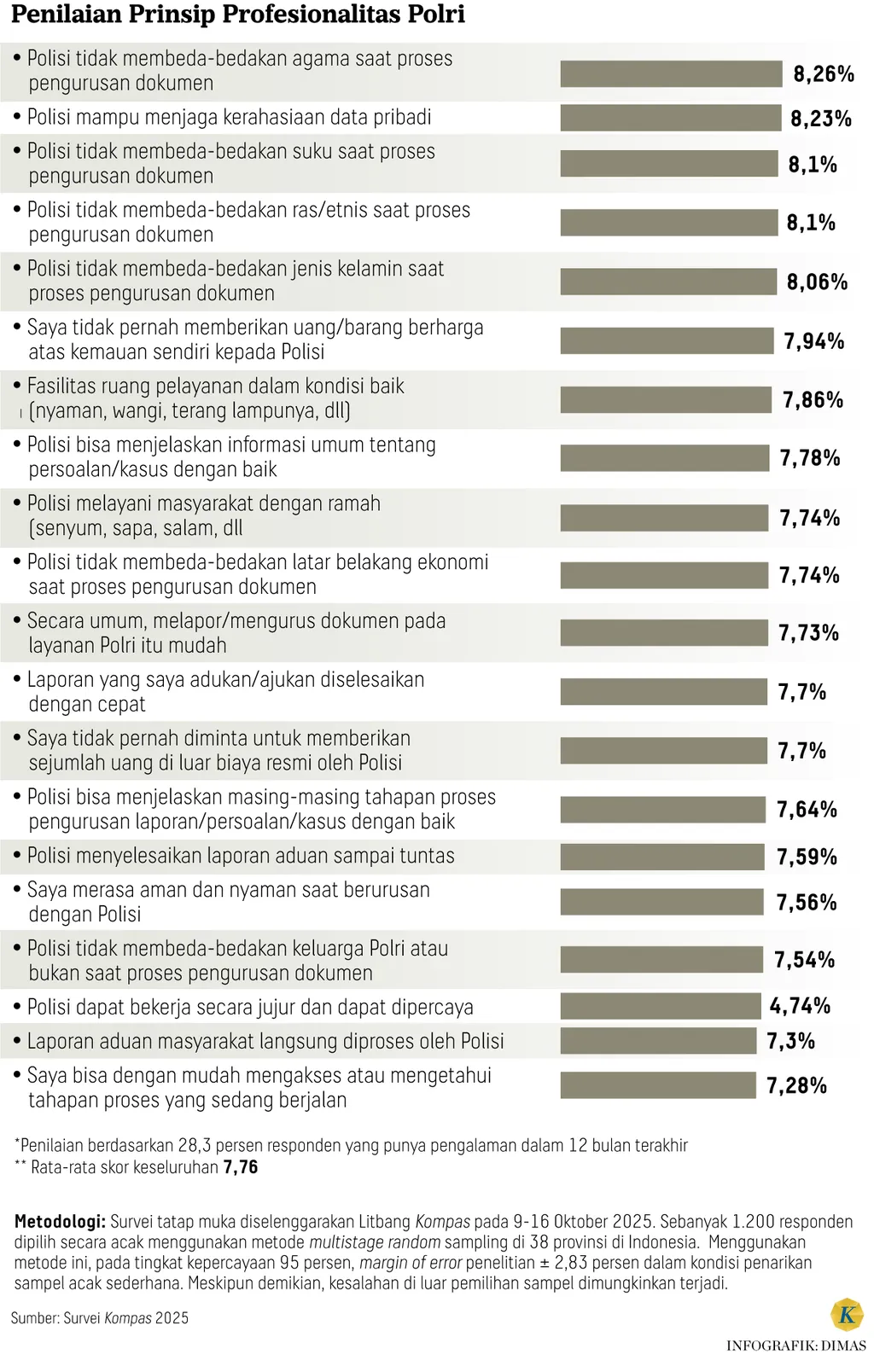 Hasil survei menunjukkan, responden yang pernah berurusan dengan Polisi, mengapresiasi sikap Polisi yang tidak membeda-bedakan agama saat pengurusan dokumen. Aspek ini mendapatkan skor sebesar 8,26 poin. Publik juga menghargai polisi yang menjaga kerahasiaan data pribadi selama proses berlangsung (skor 8,23 poin).
