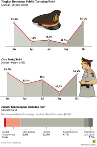 Data survei Oktober 2025 menunjukkan, tingkat kepuasan terhadap kinerja Polri mencapai 65,1 persen. Kenaikan ini merupakan bentuk pemulihan (rebound) dari titik terendah pada September 2025 karena publik merasa kecewa oleh insiden kekerasan dan jatuhnya korban jiwa dalam unjuk rasa menentang kebijakan DPR.