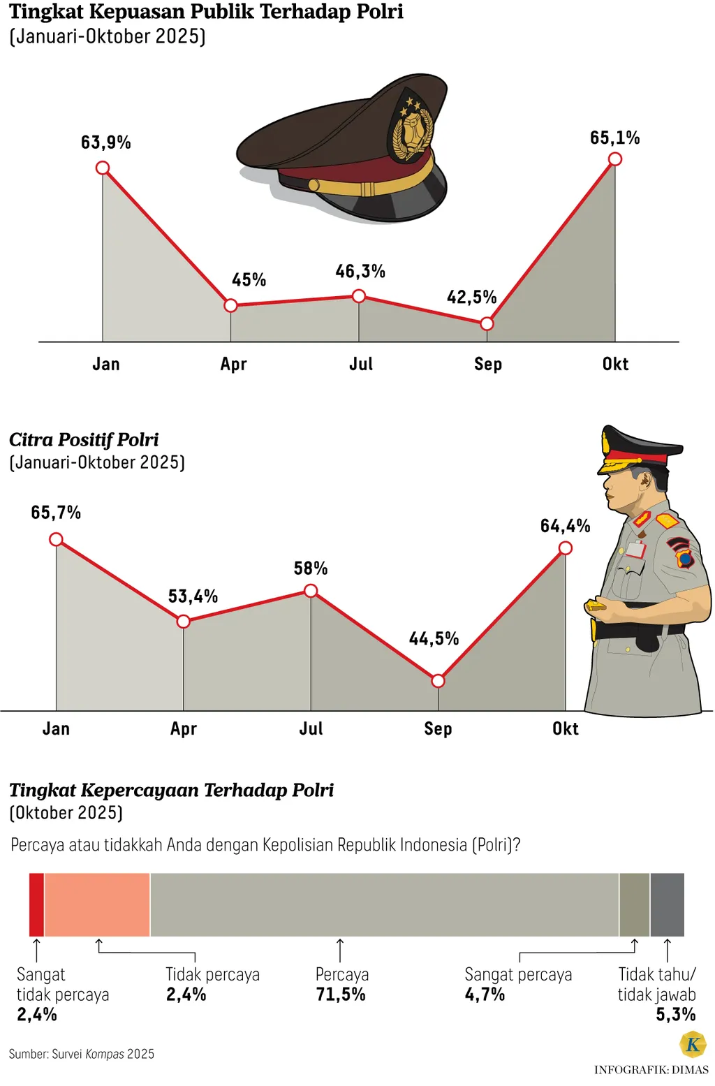 Survei Litbang Kompas pada Oktober 2025 turut memotret tanda pemulihan kepercayaan masyarakat terhadap Kepolisian Negara Republik Indonesia. Setelah mengalami penurunan tajam akibat kerusuhan besar pada Agustus 2025, citra dan kepuasan publik terhadap Polri kembali menunjukkan kenaikan. Fenomena ini menandai perubahan arah persepsi publik terhadap institusi yang selama dua dekade terakhir terus berjuang memperbaiki reputasinya.