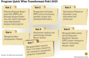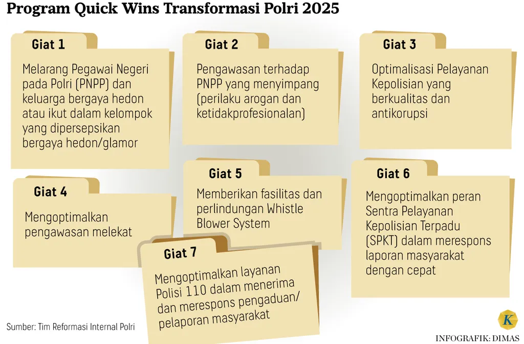 Sebagai langkah awal menindaklanjuti reformasi, tim internal Polri (Tim Transformasi Reformasi Polri) telah menyusun tujuh kegiatan langkah percepatan (quick wins) yang dilaksanakan sejak pertengahan September 2025.