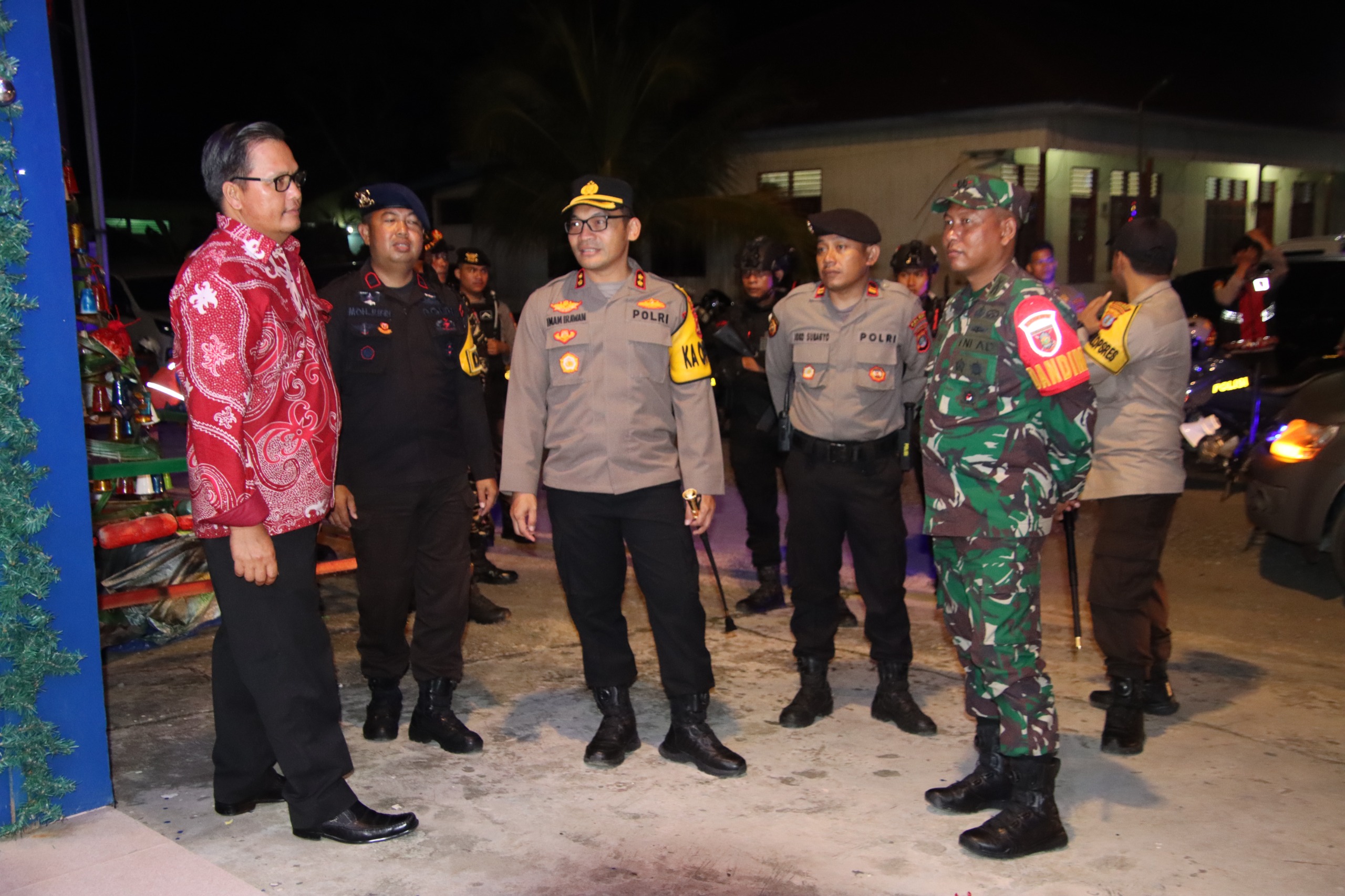 Malinau – Dalam rangka memastikan perayaan malam Natal berlangsung aman dan kondusif, Kepala Kepolisian Resor (Kapolres) Malinau AKBP Imam Irawan, S.I.K., bersama Komandan Kodim 0910/Malinau Letkol Inf Mochammad Syaiful Arif, S.I.P., memimpin langsung patroli gabungan ke sejumlah gereja di wilayah Kabupaten Malinau, Rabu malam (24/12). Patroli ini merupakan bagian dari langkah preventif aparat keamanan guna memberikan rasa aman kepada umat Kristiani yang melaksanakan ibadah malam Natal.